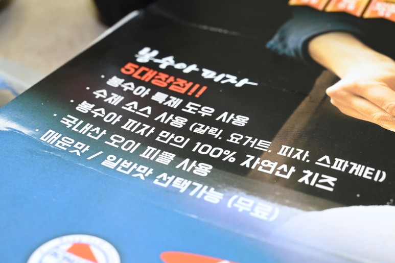 봉수아 특제 도우, 수제 소스, 100퍼 자연산 치즈, 국내산 오이 피클, 매운맛 일반맛 무료 선택.