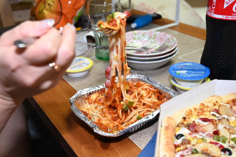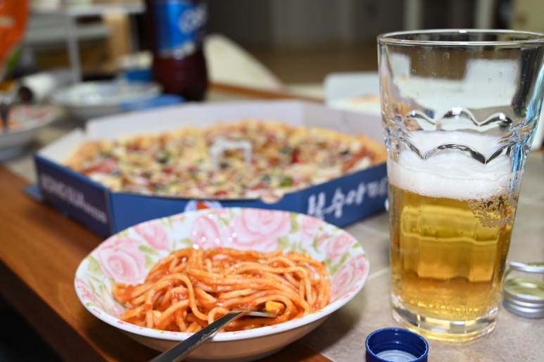 맥주와 참 잘 어울리는 스파게티와 피자 조합.