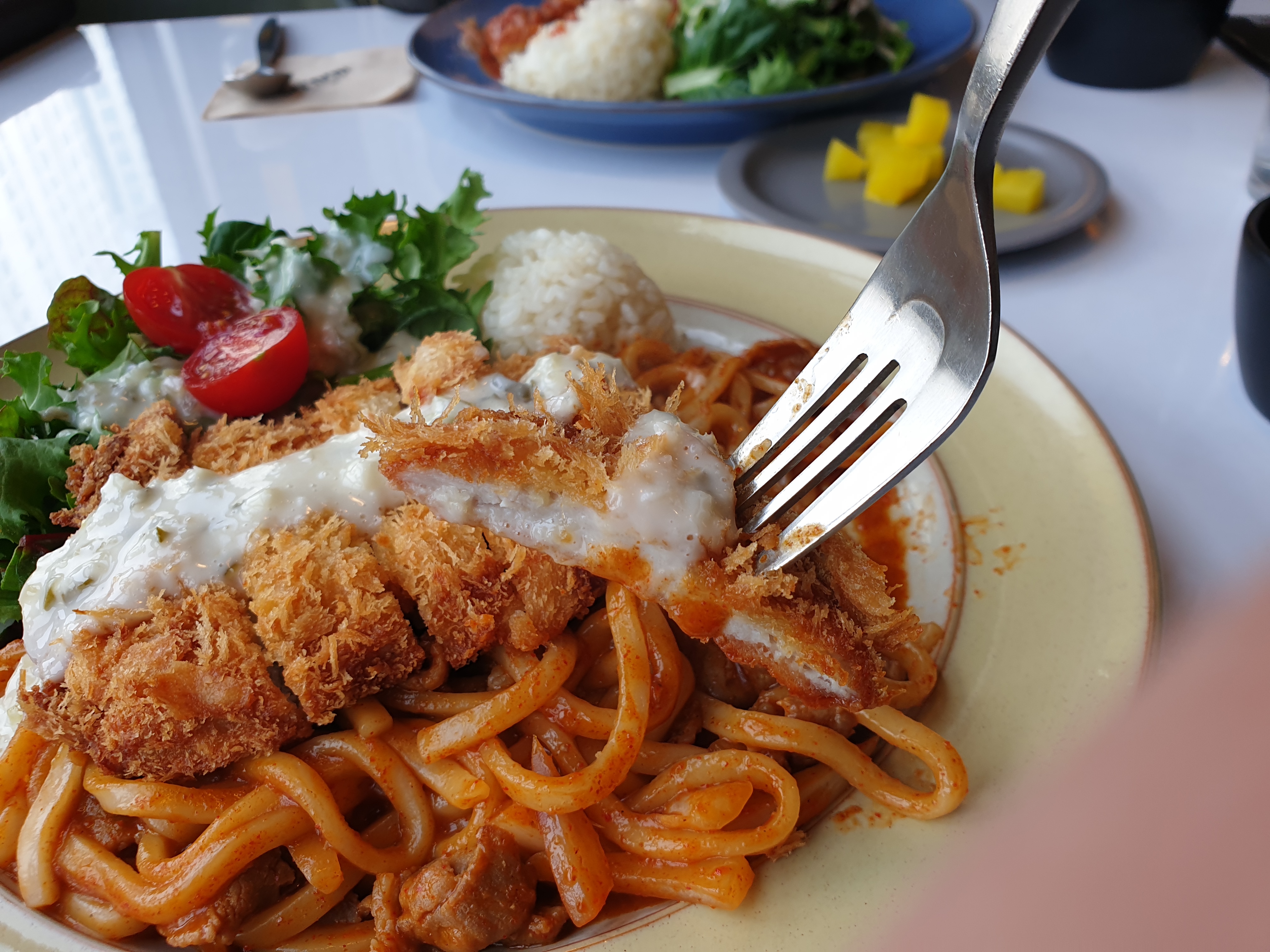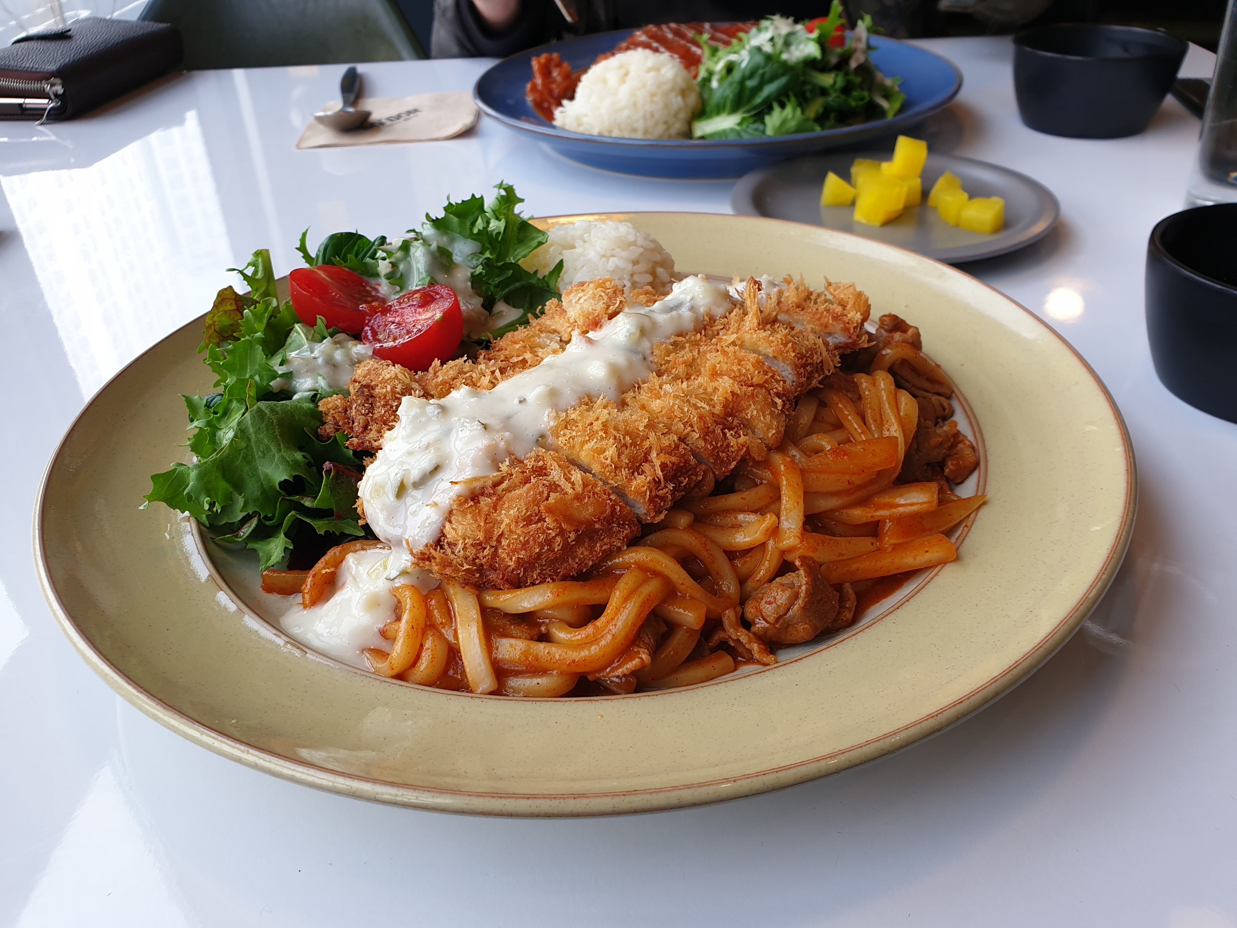 맵기 조절 불가한 제육볶음우동인데요 매운 제육볶음우동에 뜨돈 돈가스를 함께 맛볼 수 있는 메뉴에요 돈가스 소스는 뜨돈 돈가스와 다른 소스인데 색다른 맛이었어요.