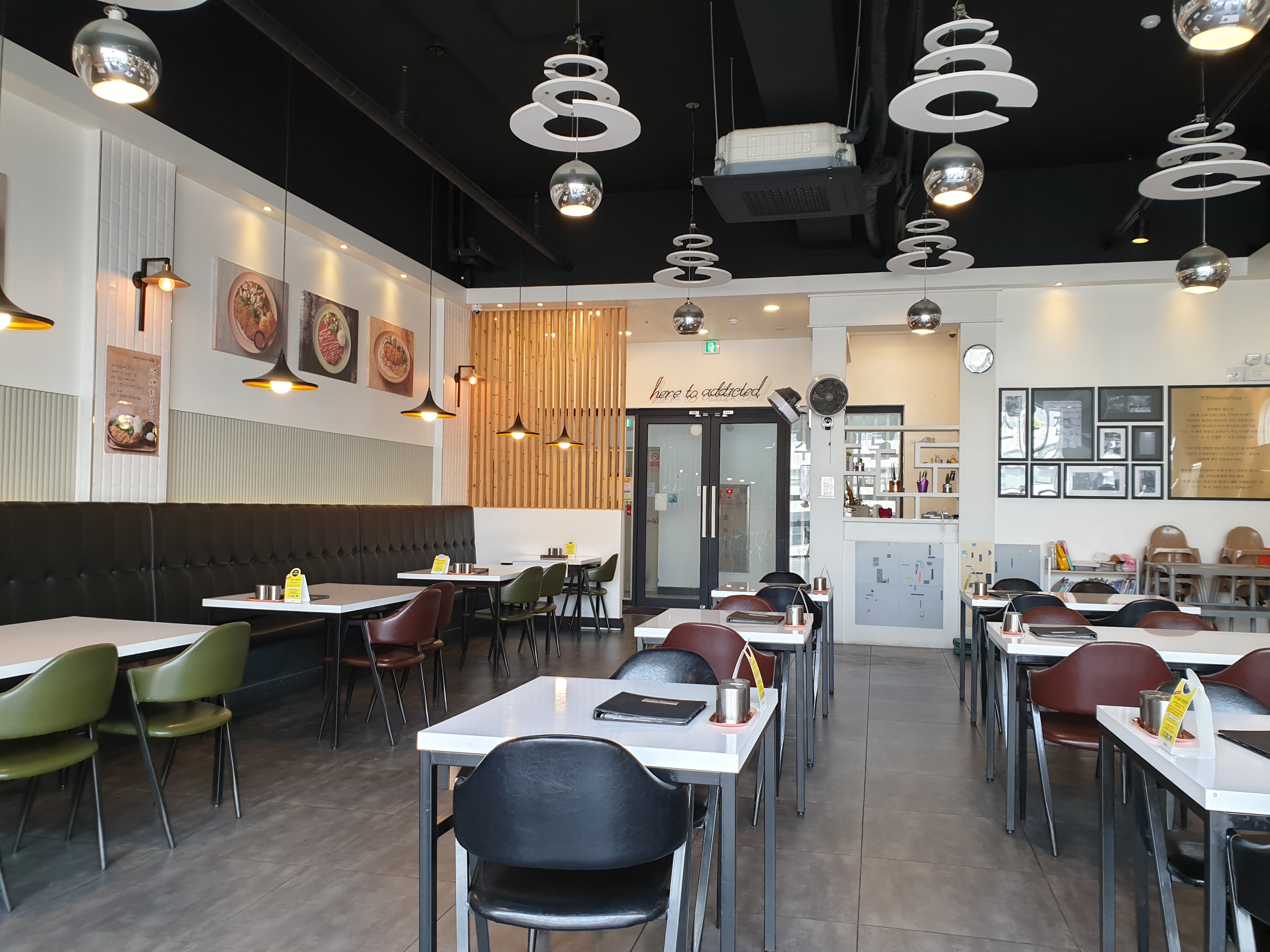 코로나의 영향인지 우리 가족이 오늘 첫 손님인 것 같아요 넓고 탁 트인 홀에는 2인용 4인용 테이블과 아이들 테이블이 준비되어 있습니다.