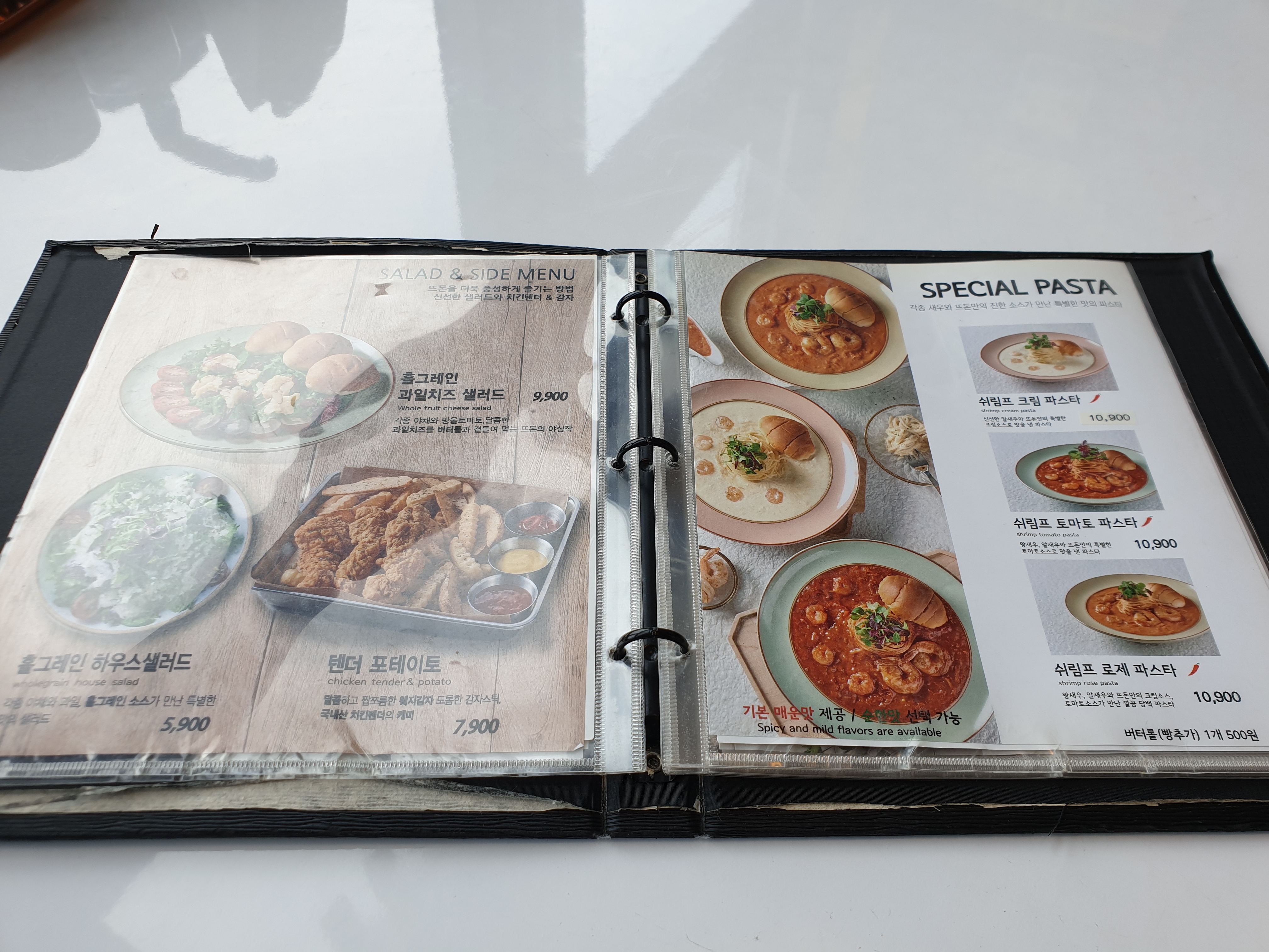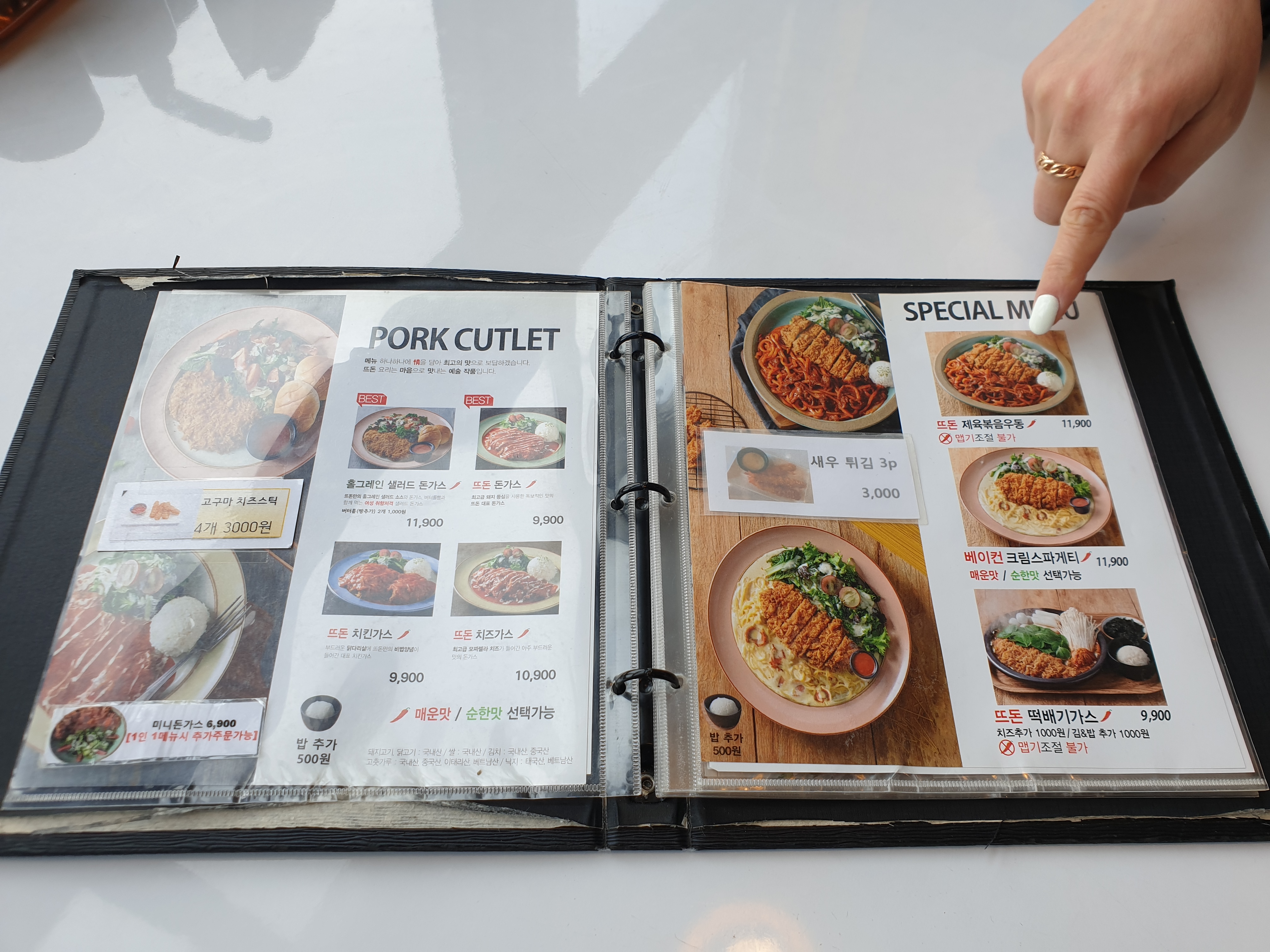 수제돈가스 전문점 답게 돈가스 메뉴 가짓수가 적지 않아요.. 집사람은 뜨돈 기본 메뉴 9,900원 뜨돈 돈가스, 저는 11,900원 제육볶음우동 돈가스를 주문 했는데 뜨돈 돈가스는 매운맛과 순한맛 중 선택이 가능하고 제육볶음우동은 맵기조절이 안되네요.