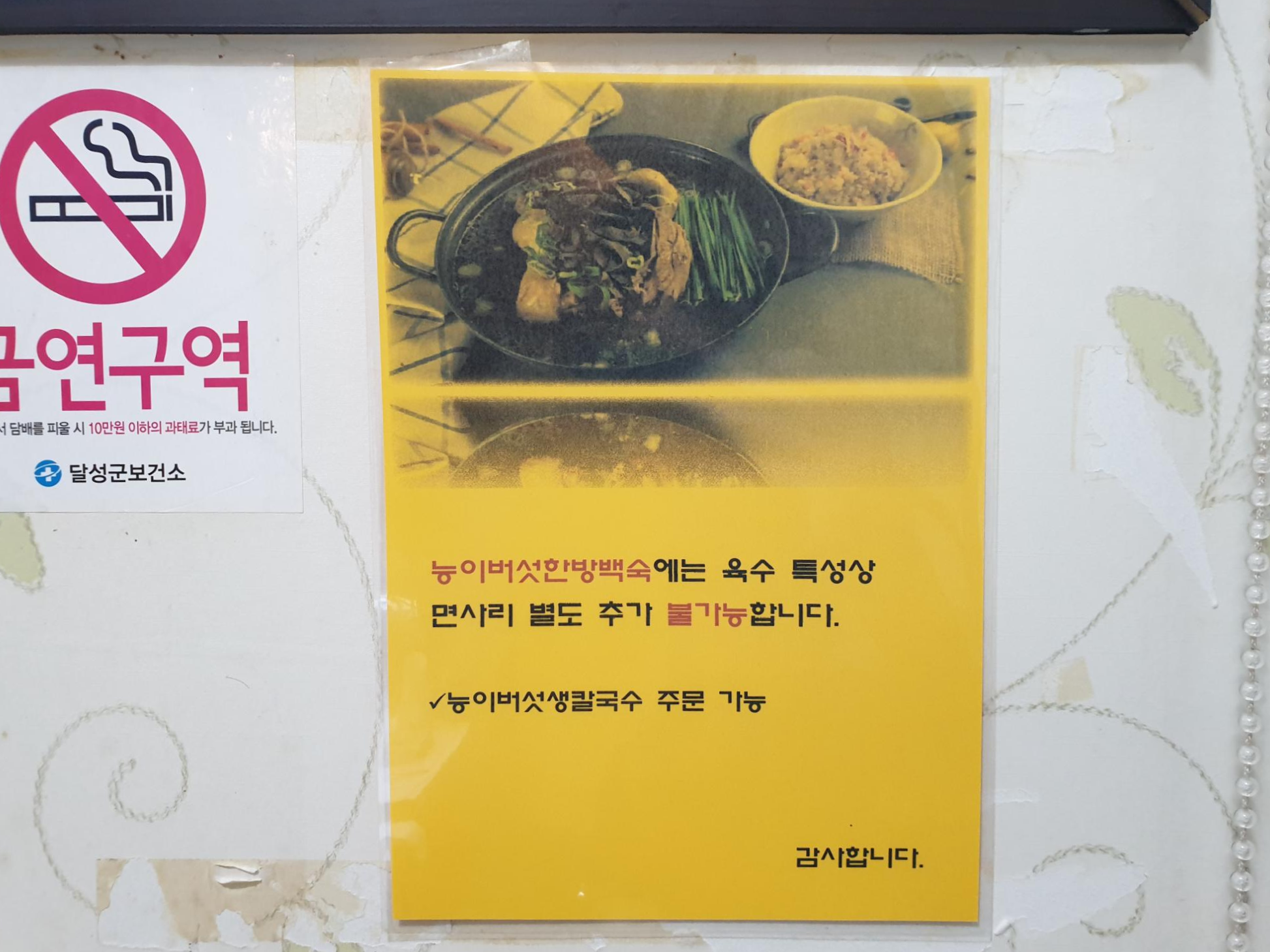 음식에 대한 마인드를 볼 수 있는 안내문입니다. 육수 특성상 능이버섯한방백숙에는 면사리 별도 추가 불가능하다는데 아무래도 칼국수가 들어가면 시원한 육수가 텁텁해 질 것을 우려한 것 같네요..