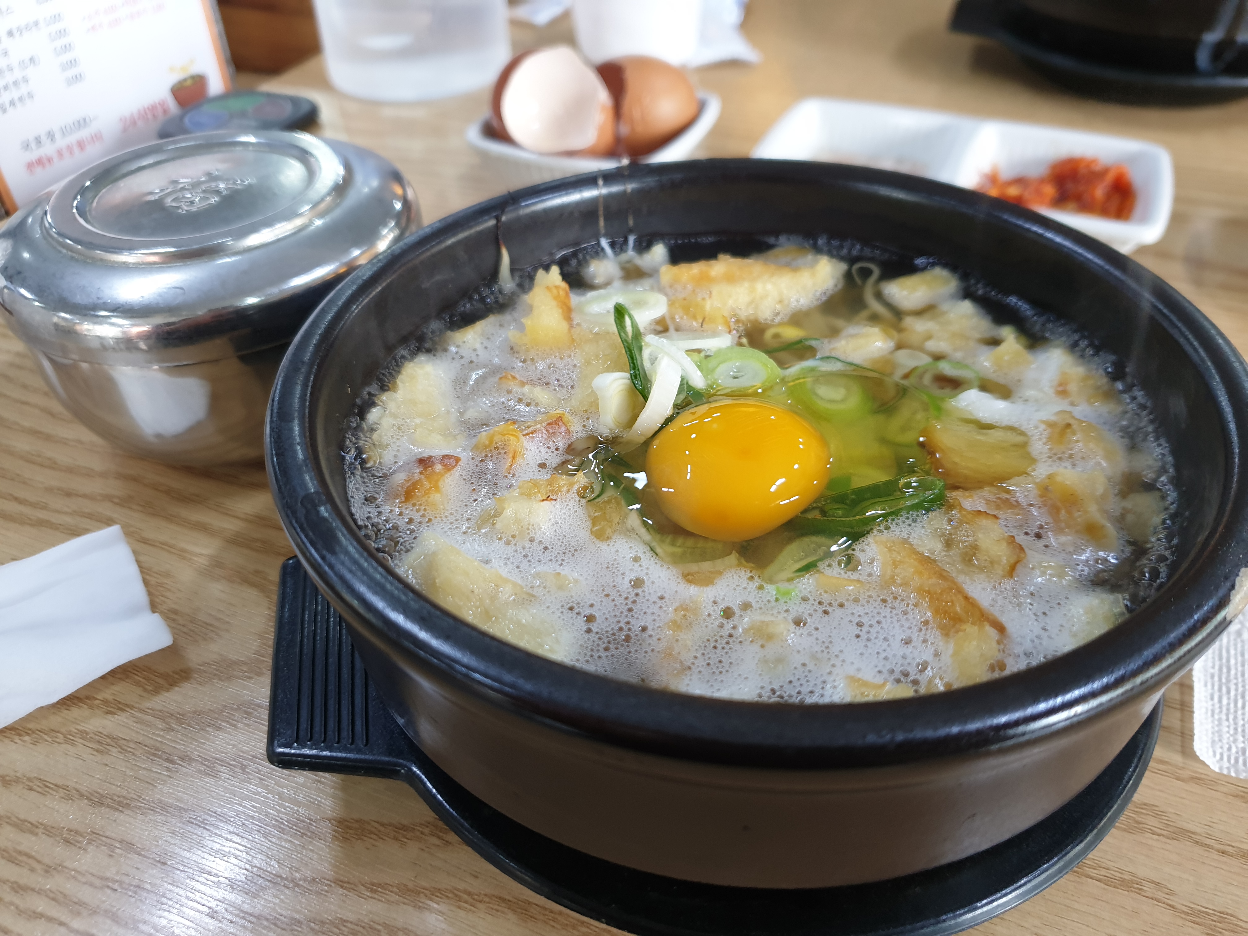 아무튼 콩나물국밥의 시그니쳐이지요 날계란을 콩나물국밥 위에 조심히 깨서 올려준 다음 노른자가 터지지 않게 감춰두 듯 콩나물국밥 아래쪽으로 살살~~ 덮어 줍니다. 왜냐?? 아시다시피 콩나물 국밥의 진수는 국물인데 개인차가 있겠지만 노른자 터지면 국물이 부드러워지긴 하겠지만 시원함이 반감되기 때문이지요.. 정말 온 힘을 다해야 한답니다.ㅋㅋㅋㅋ
