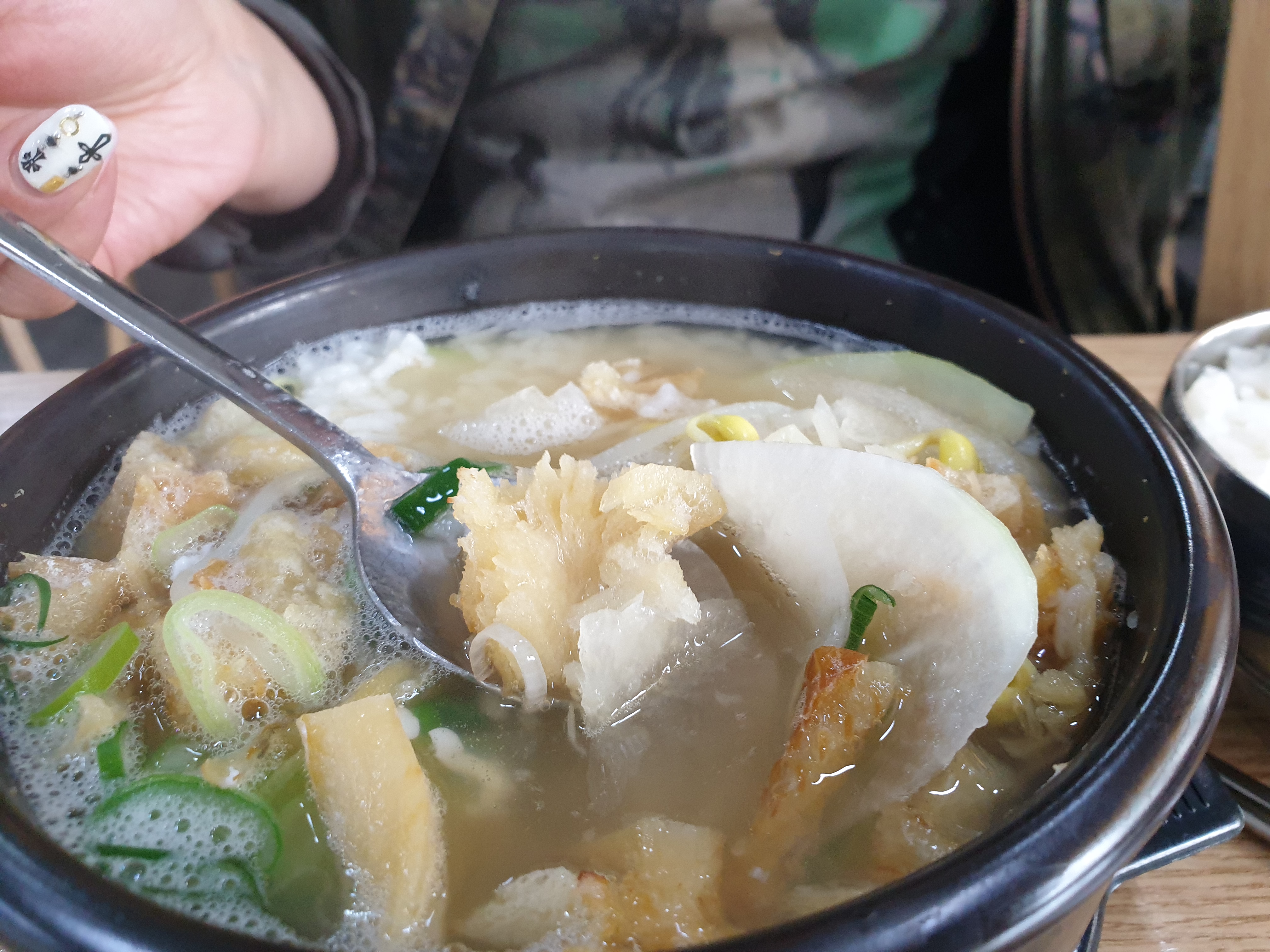 콩나물은 기본, 황태 양도 많고 시원한 맛을 배가하기 위해 무우도 들어가 있고 게다가 5,500원의 가격에 이 정도 정성이면 가성비 최고의 해장국이 아닐런가 싶어요. 그리고, 반찬으로 나오는 오징어젓갈의 오징어가 적지 않게 들어 있어서 두 번 더 가져다 먹었네요.^^