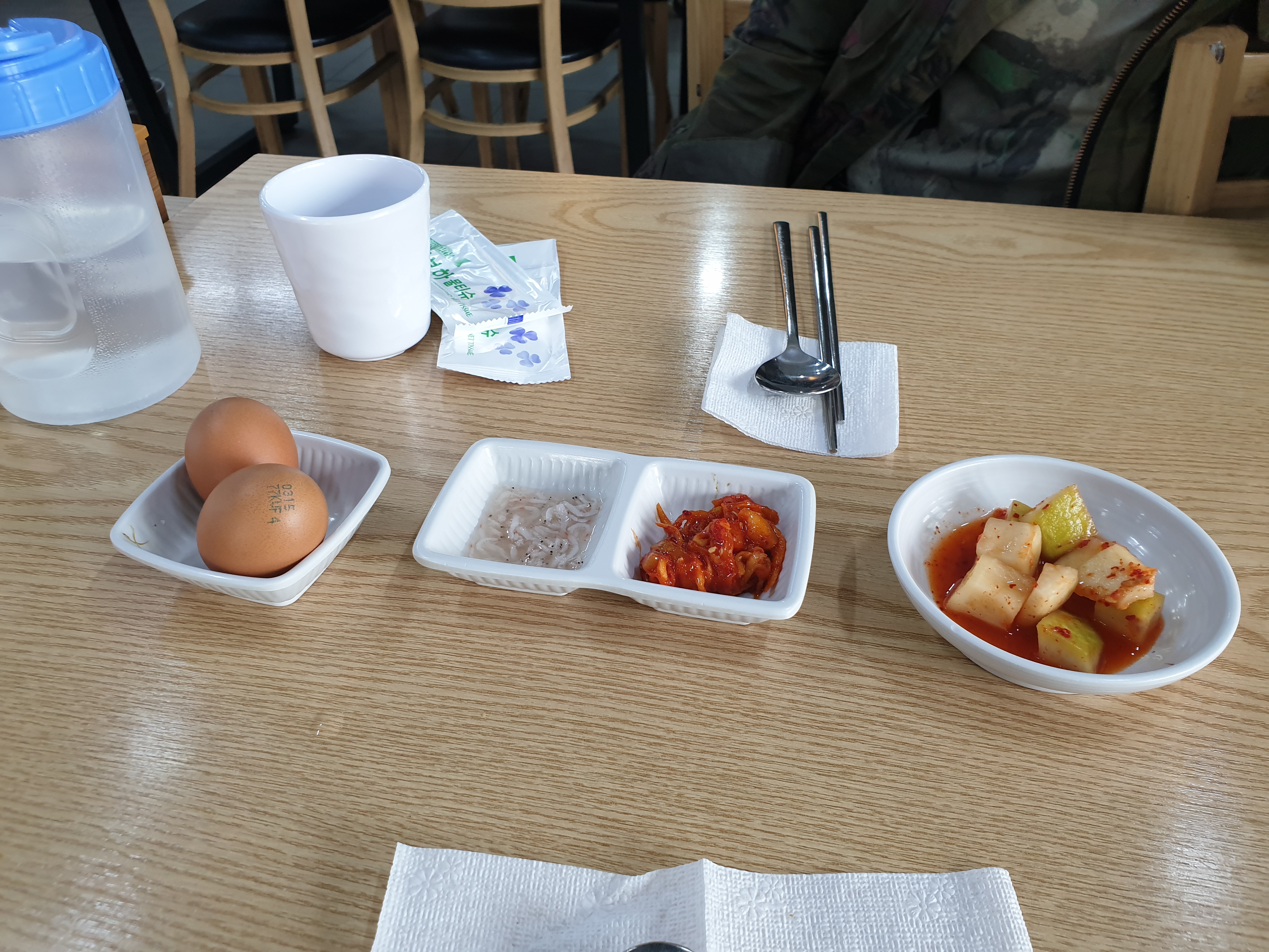 주문과 동시에 반찬이 차려지는데 새우젓, 오징어젓갈, 깍두기, 그리고 콩나물국밥에 넣을 날계란까지... 이 역시나 똑같은 메뉴입니다. 친정집에 온 기분인걸요 ㅋㅋㅋ
