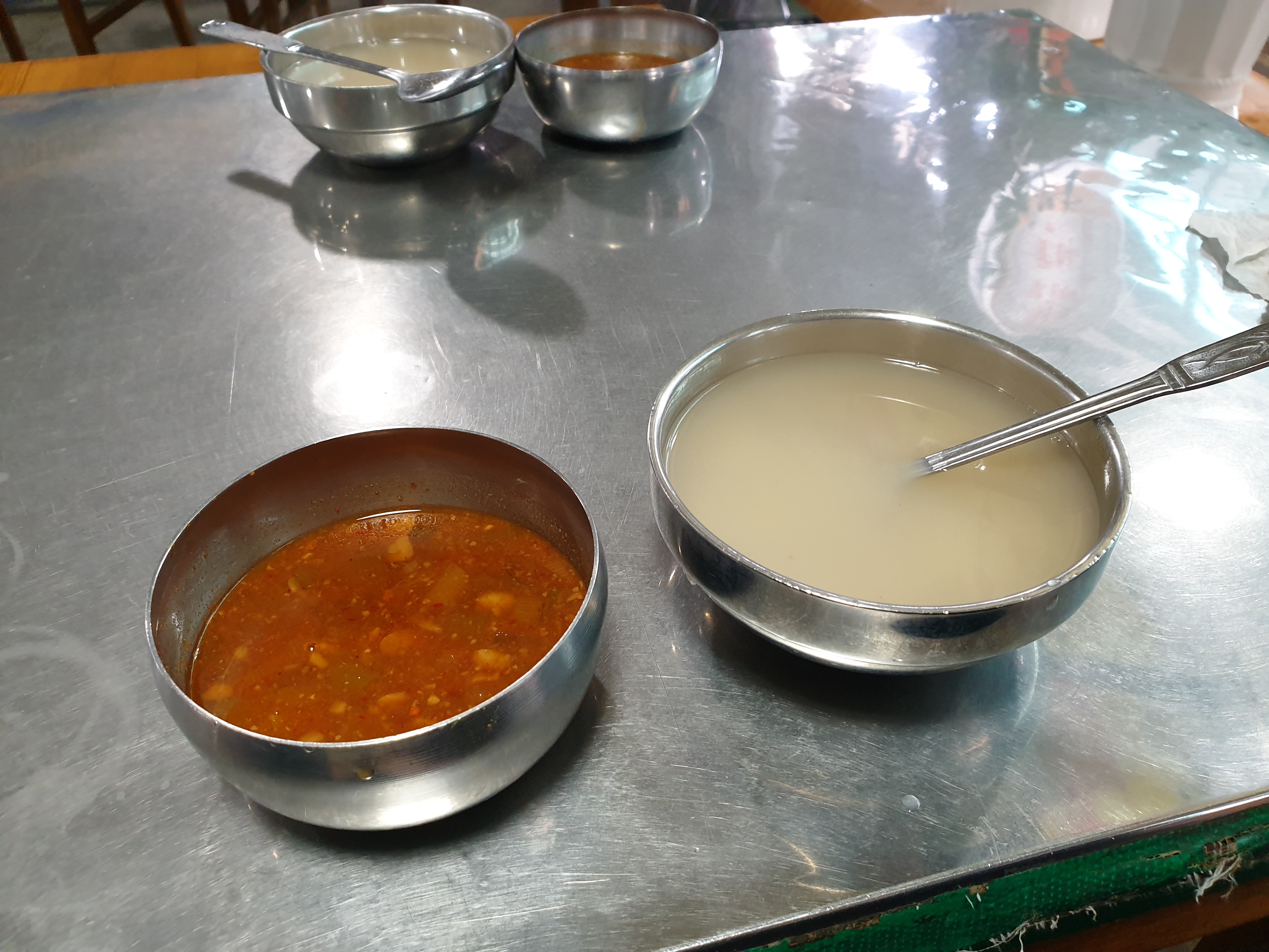 보리밥 단일메뉴라 손 깨끗히 씻고 자리 잡고 앉으면 자동으로 숭늉(누룽지)과 강된장을 일인당 하나씩 지급이 되는데 이 강된장이 보리밥의 모든 것이라 해도 과언이 아닐만큼 짭짤하면서 구수하고 쌀짝 매운기가 도는 감칠맛이 끝내줍니다. 또한 숭늉은 이런 강된장에 비벼 먹는 보리밥의 보조역할로서 이 조합이 정말 좋습니다.