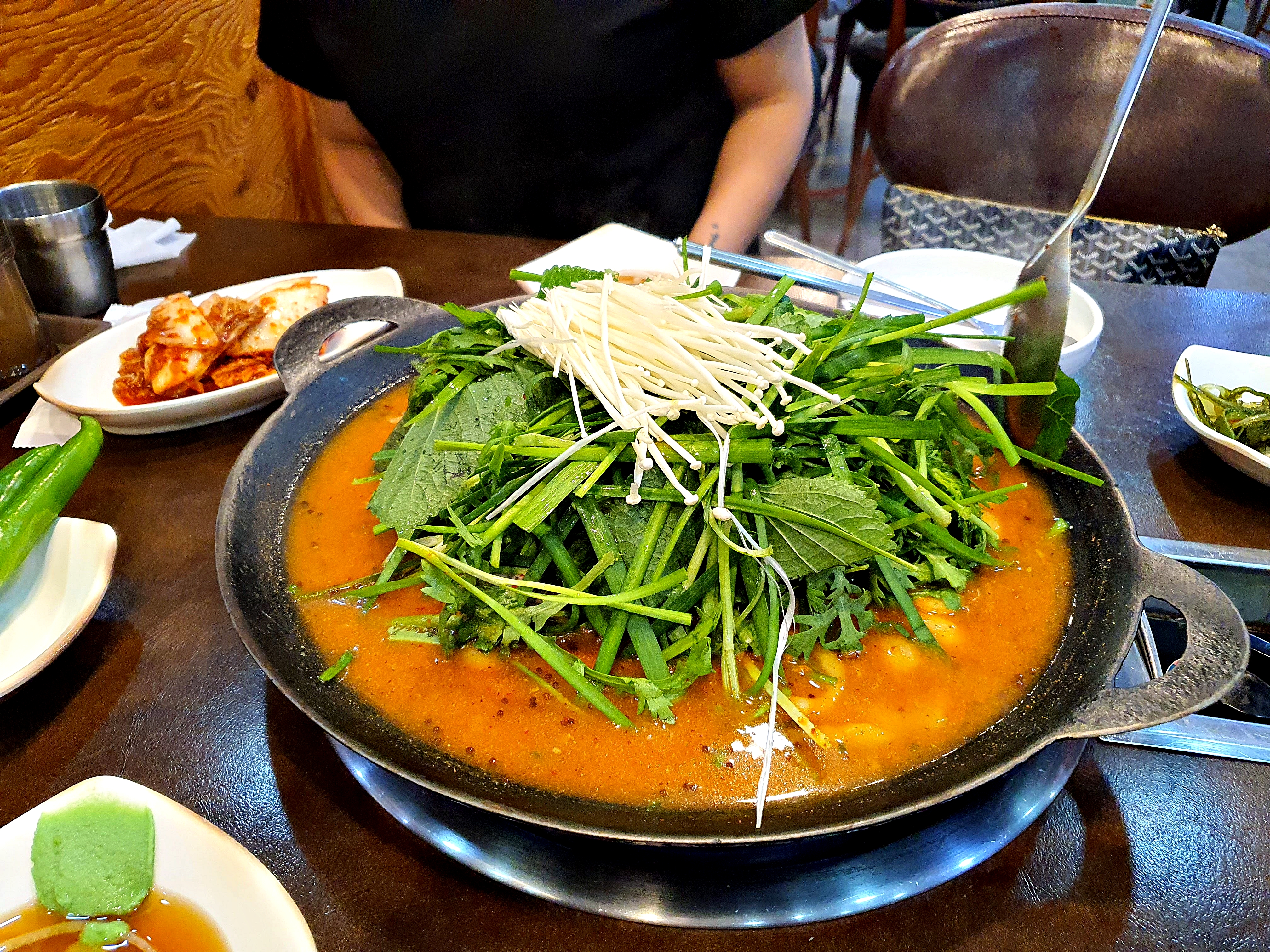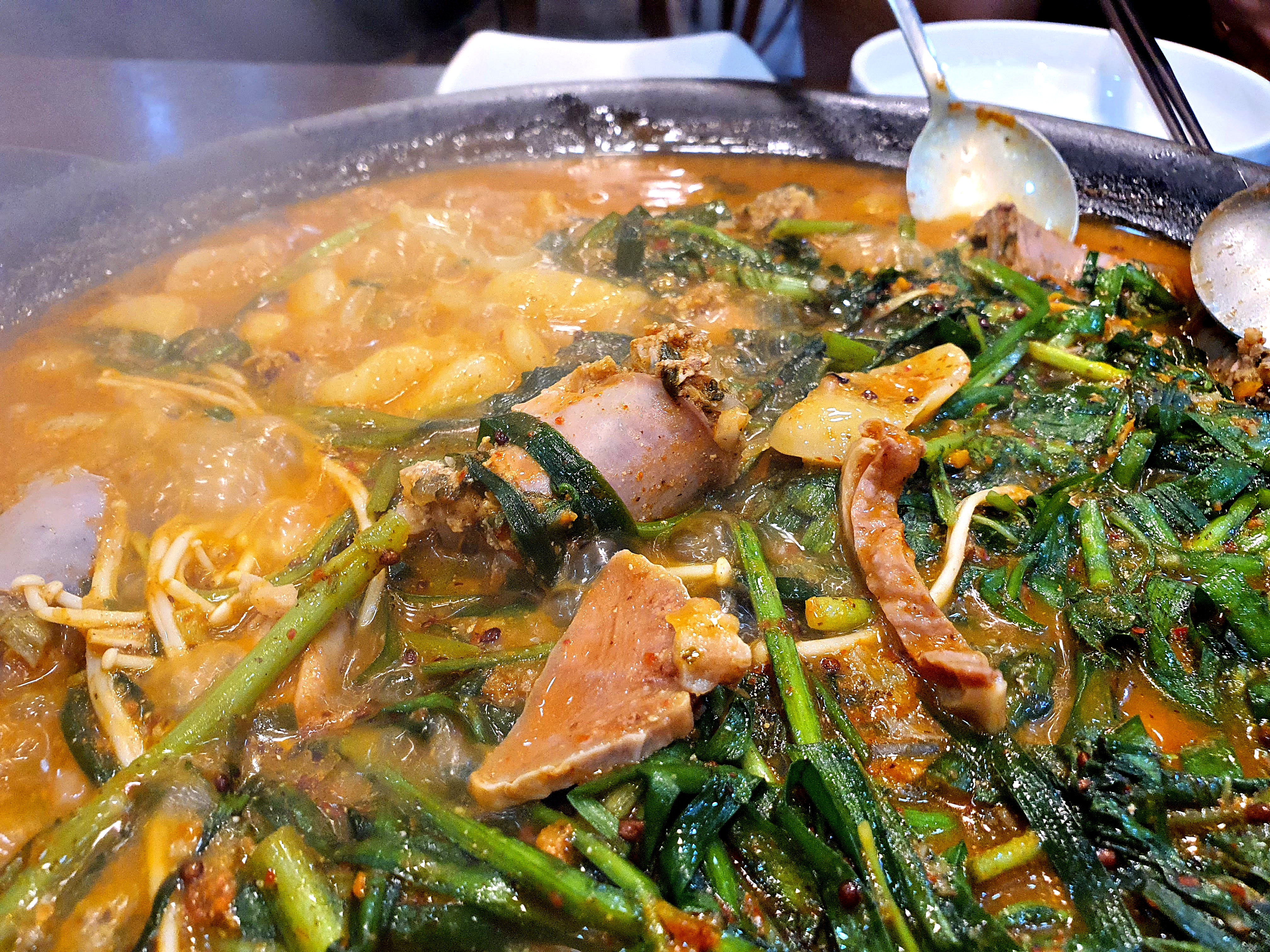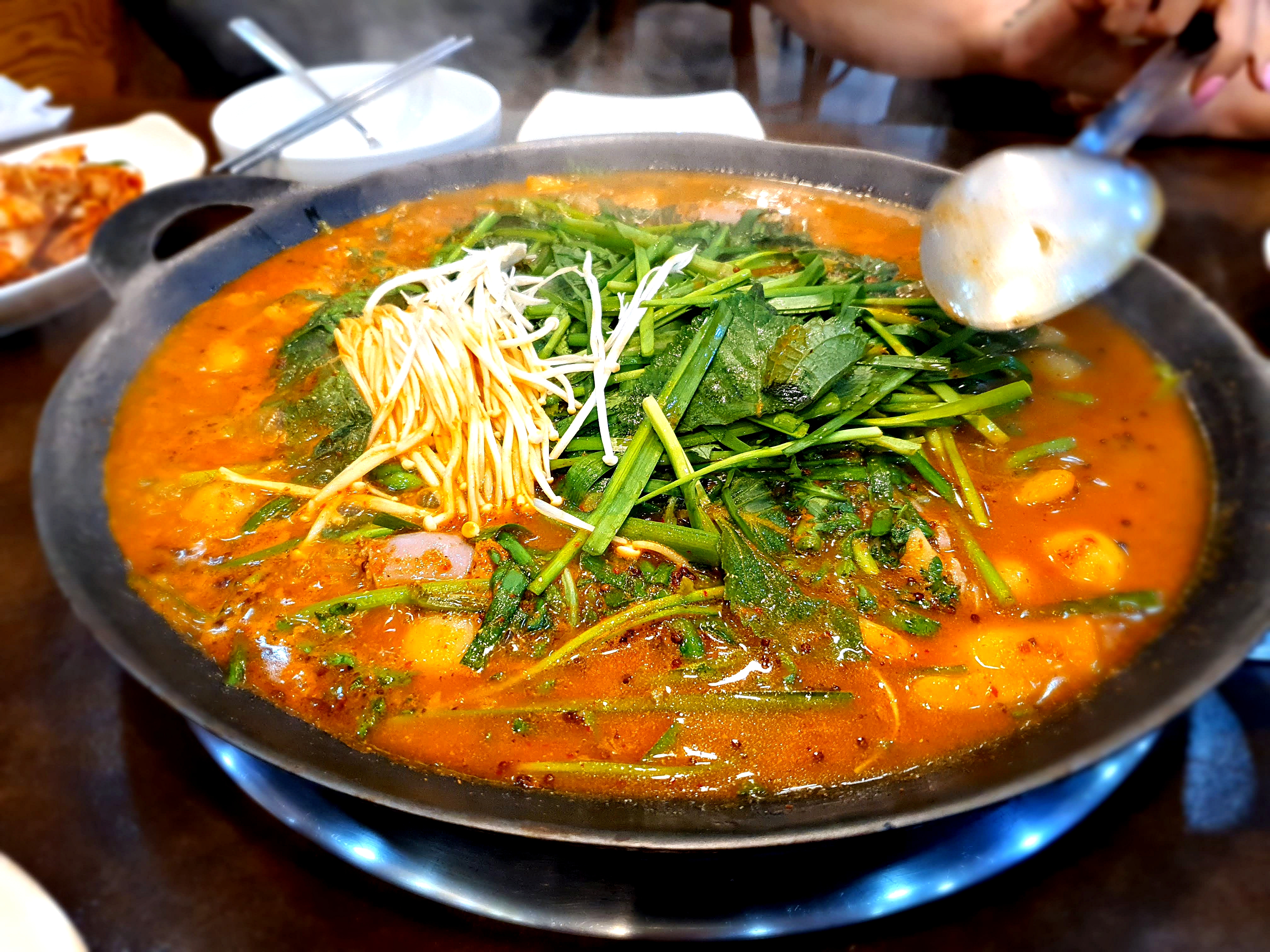 무쇠전골냄비 위 전골이 끓고 정구지,깻잎의 숨이 죽어가는 이 순간이 견디기 가장 힘들다 ㅋㅋㅋ