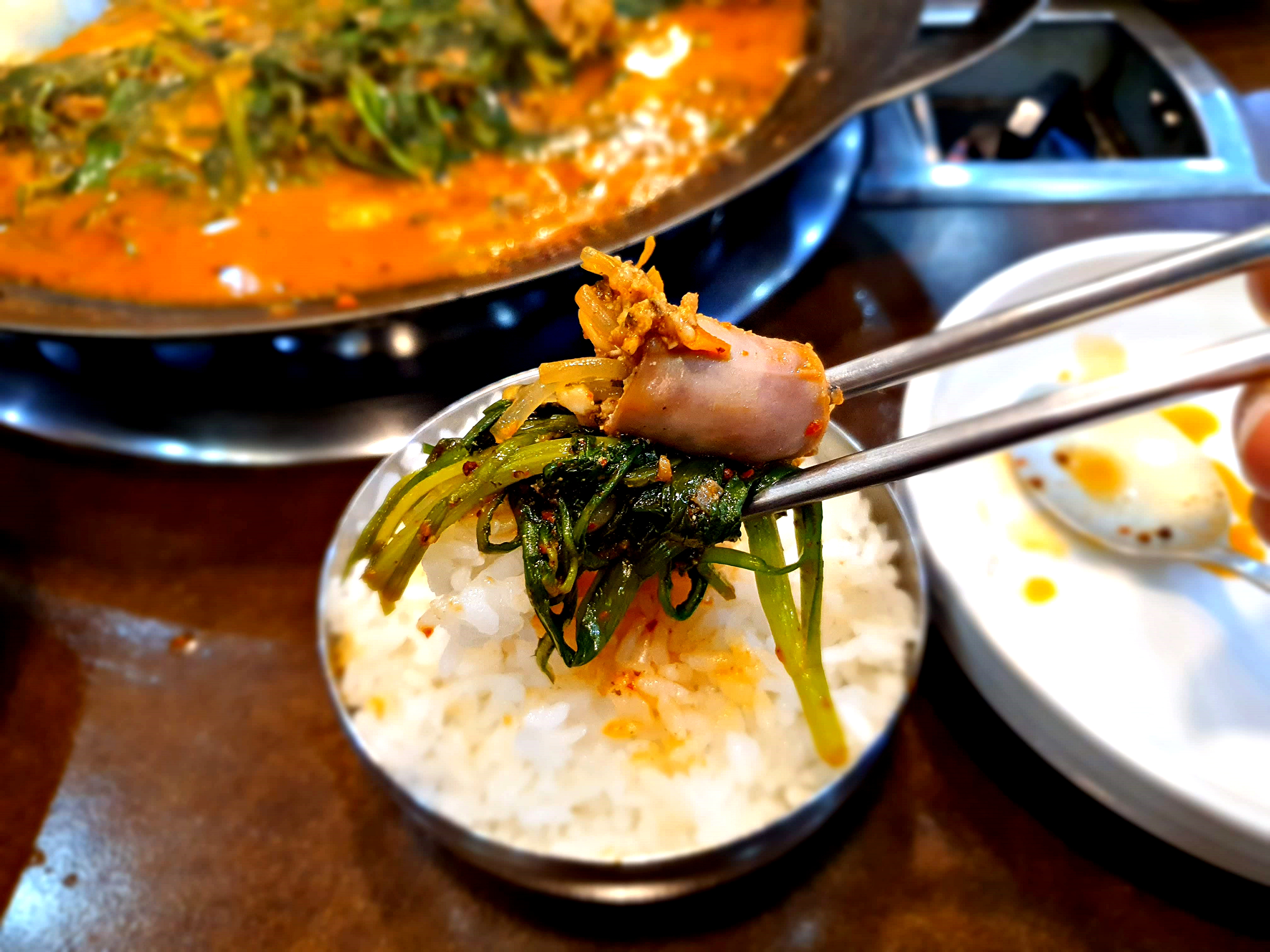 밑반찬에 젓가락질 좀 할까 싶으니 어느새 순대전골 입장! 무쇠전골냄비에 2인분일까 싶을 정도로 푸짐하다.