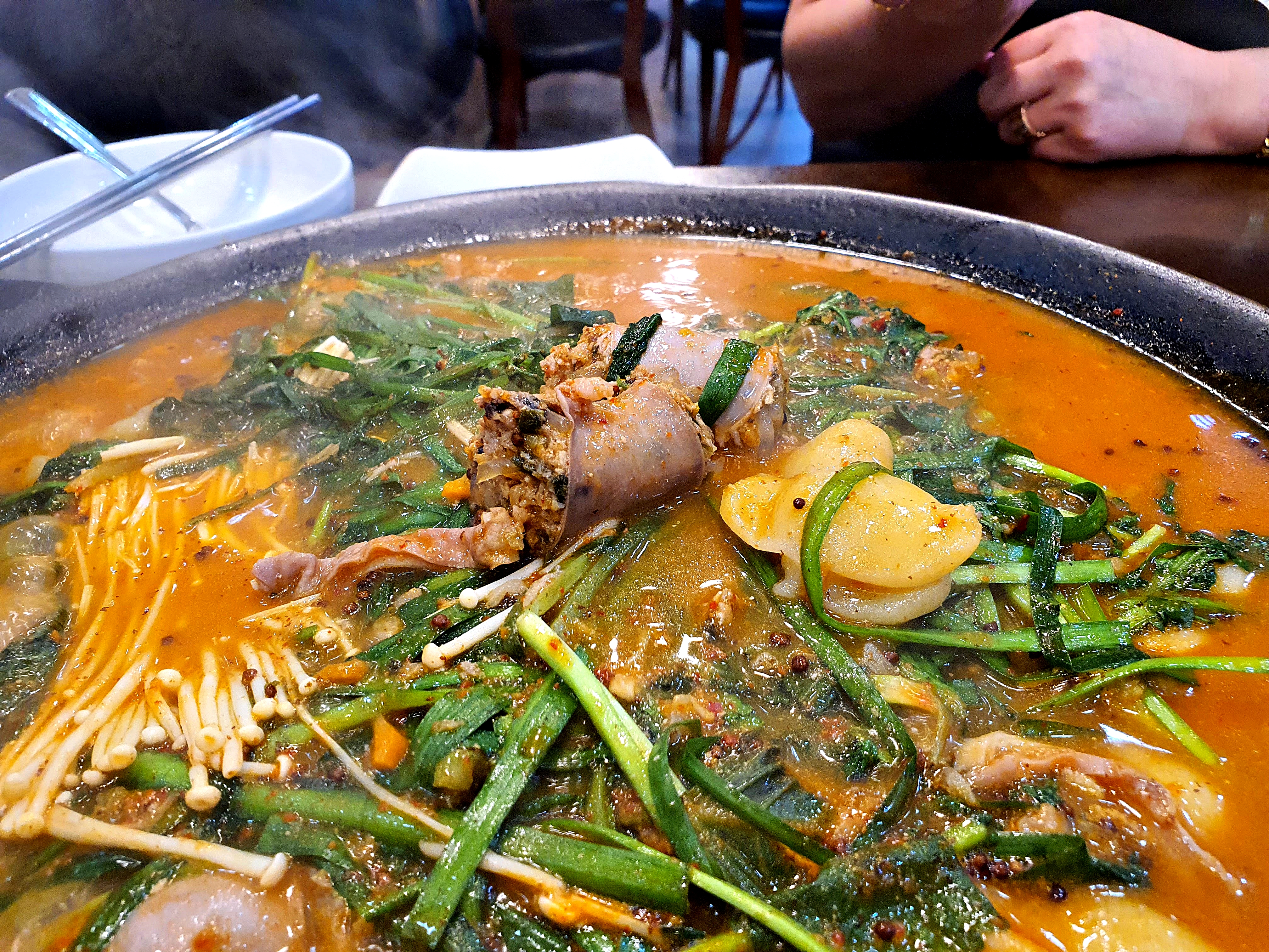 저녁 7시 30분경 들어갔는데 계모임팀 포함 5테이블이 돌아가고 있었고, 다 먹고 나갈때까지 5팀 정도 더 들어왔으니 동네맛집은 확실한 걸로^^ 마눌님과 둘이 갔으니 우선 주력 메뉴 순대전골 2인분과 사리 매니아 마눌님을 위해 수제비 사리 추가.. 순대전골에 기본 수제비 들어가 있다고 함.