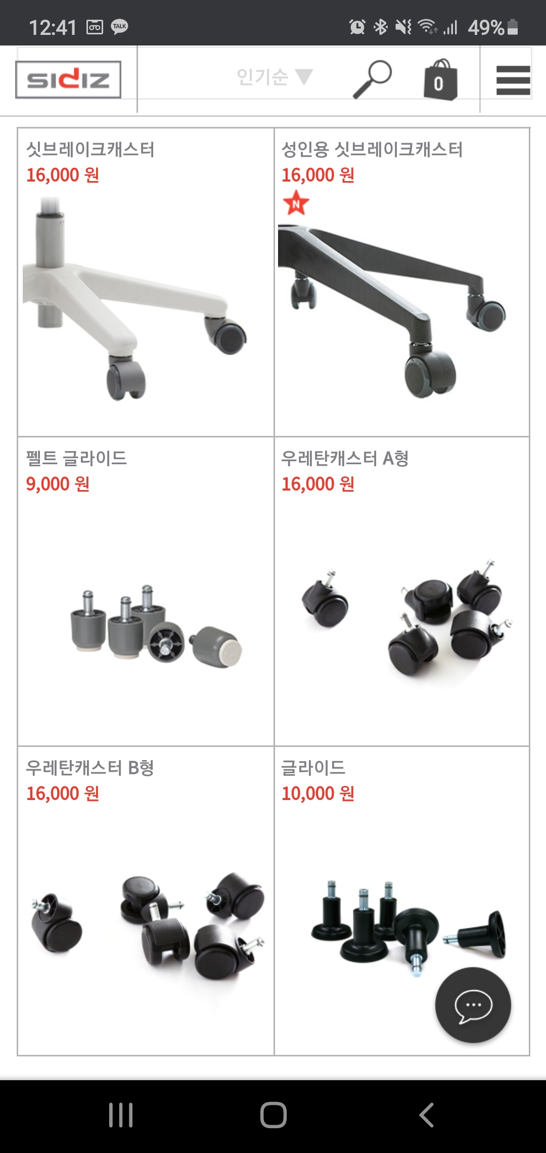 시디즈 홈페이지(https://www.sidiz.com/) 악세사리부분에 가면 caster.glide에서 구입하면 된다. 내 제품은 T50이고 기존 바퀴가 우레탄캐스터A형, 이동시에는 쉽게 움직이고 착석시 고정이 되는 싯브레이크캐스터가 땡겼지만 굳이?라는 생각이 들었고 우레탄캐스터로 하려니 또 찌꺼기 묻어나올게 뻔해서 이번에 고정식 글라이드를 구입해 보았다. 가격은 10,000원으로 배송비는 별도이다.