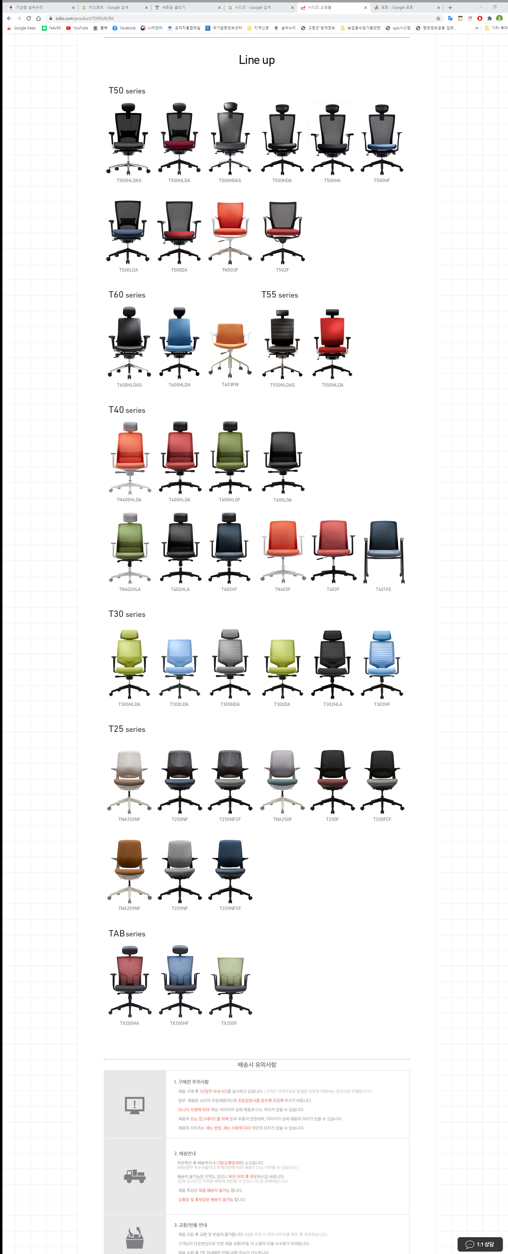 각 제품을 클릭하면 의자 라인업을 보여주고 있으므로 확인 후 구입해야 한다.