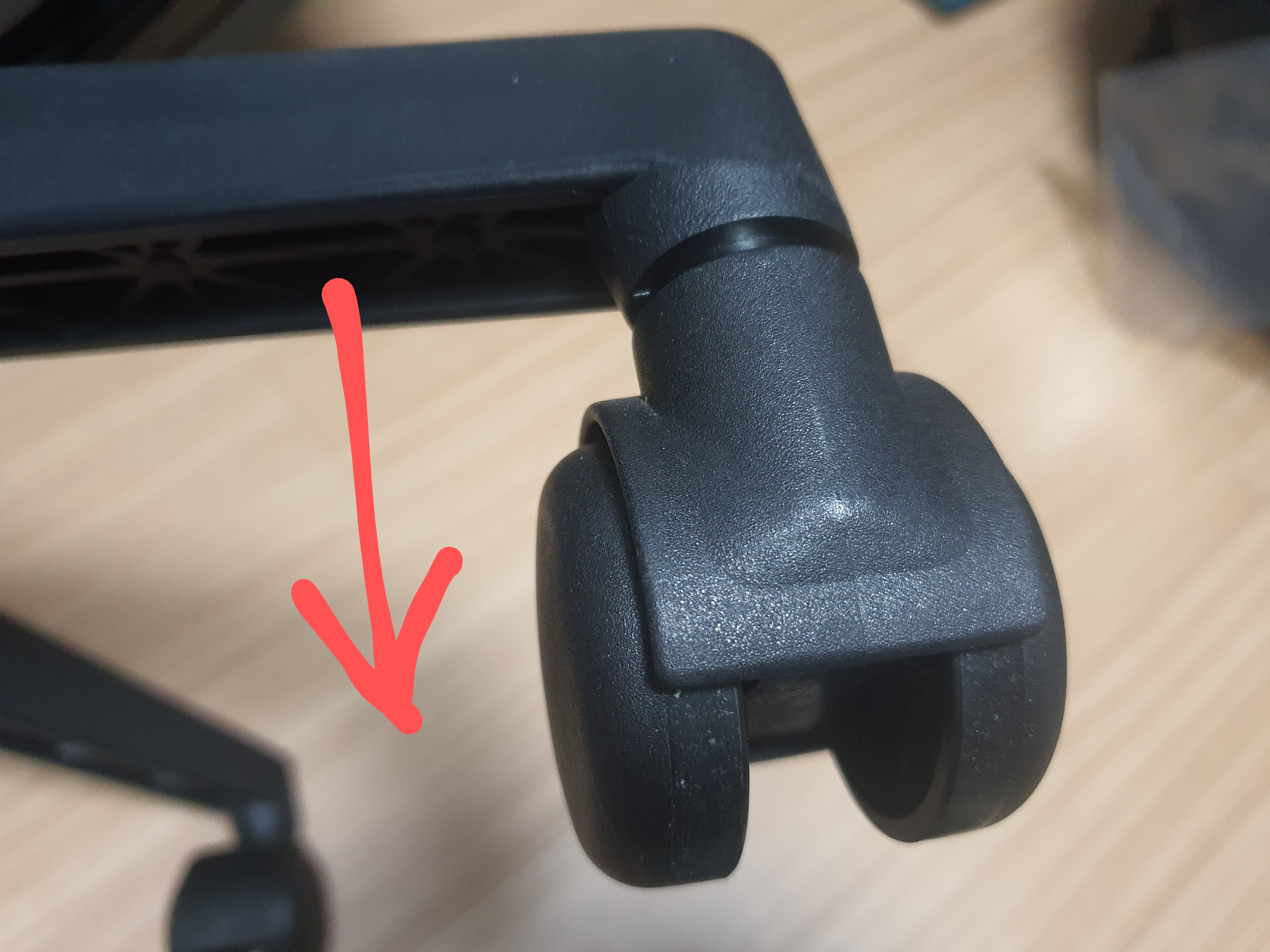 교체방법은 몹시 쉽다. 밥 먹을 힘만 있어도 가능한데 기존 바퀴를 꽉 잡고 의자 아랫방향, 즉 화살표 방향대로 힘 줘서 확 잡아댕기면 빠지는데 부러질까 어쩔까 걱정은 하덜덜 말아도 된다.