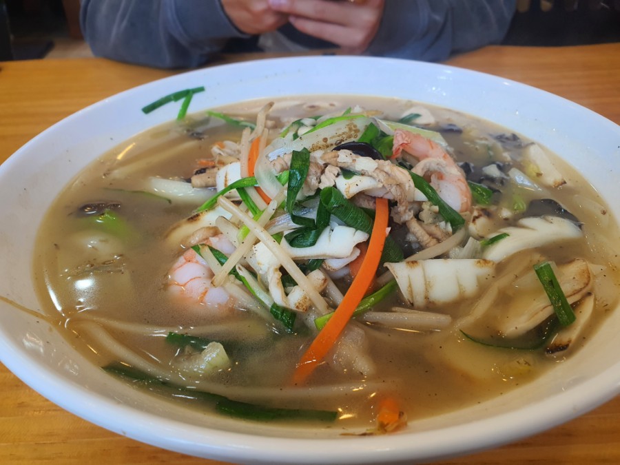 짬뽕의 처음과 끝은 국물, 숟가락으로 하얀짬뽕의 약한 기름기 있는 짬뽕국물을 맛보려 머리를 숙였는데 오메 이거 진한 불향이 내 코를 확 스쳐가는데 이거 대박이란 단어가 머리에 떠오름과 동시에 짬뽕국물을 들이켰는데 구수하며 깔끔한 국물 맛이 아무래도 짬뽕국물이니 기름지겠지 했던 내 생각을 여지 없이 저 안드로메다로 보내 버렸고 어제 음주로 지쳐있던 나의 속들에게 미안함을 전하며 그 국물을 연거푸 입속으로 떠넣게 되었다
