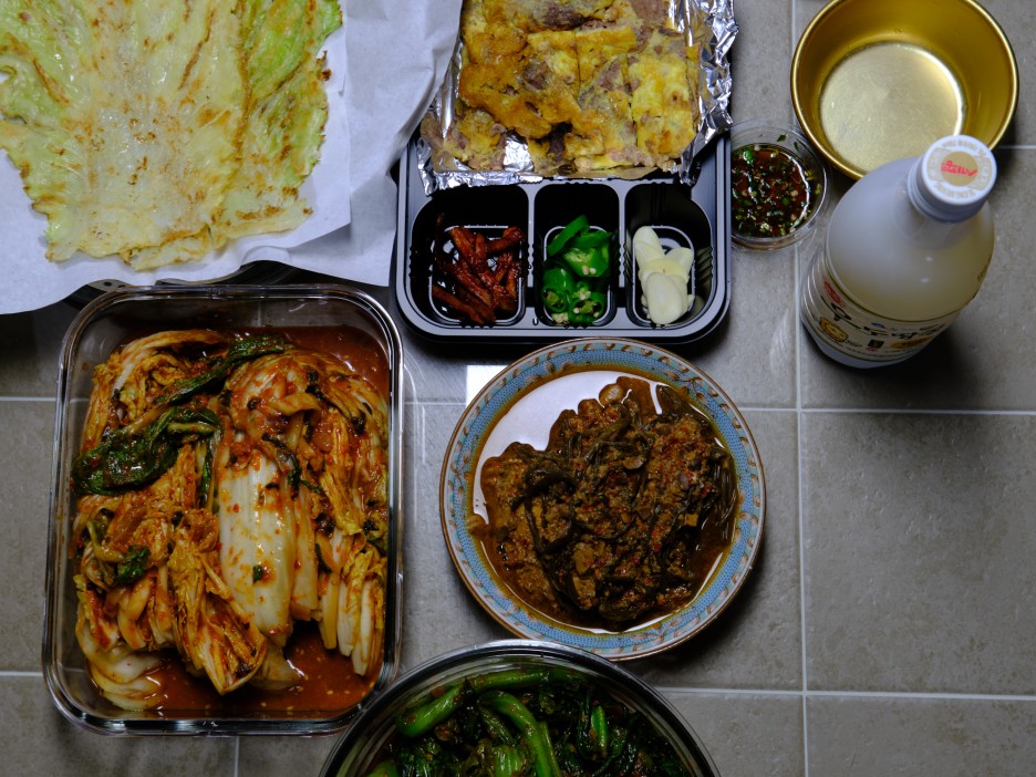 지인이 직접 농사 지어 건내 주신 알배추를 된장에 찍어 먹었더니 너무 너무 맛있길래 배추찌짐으로 맛있게 부쳐놓고 또 다른 지인이 챙겨 주신 육전과 또또 다른 지인이 주신 여수돌산갓김치까지 한 테이블에 올려 놓고 언제 냉장고에 들어 있었는지도 몰랐던 우도땅콩막걸리를 한잔 해뻐린 날이다