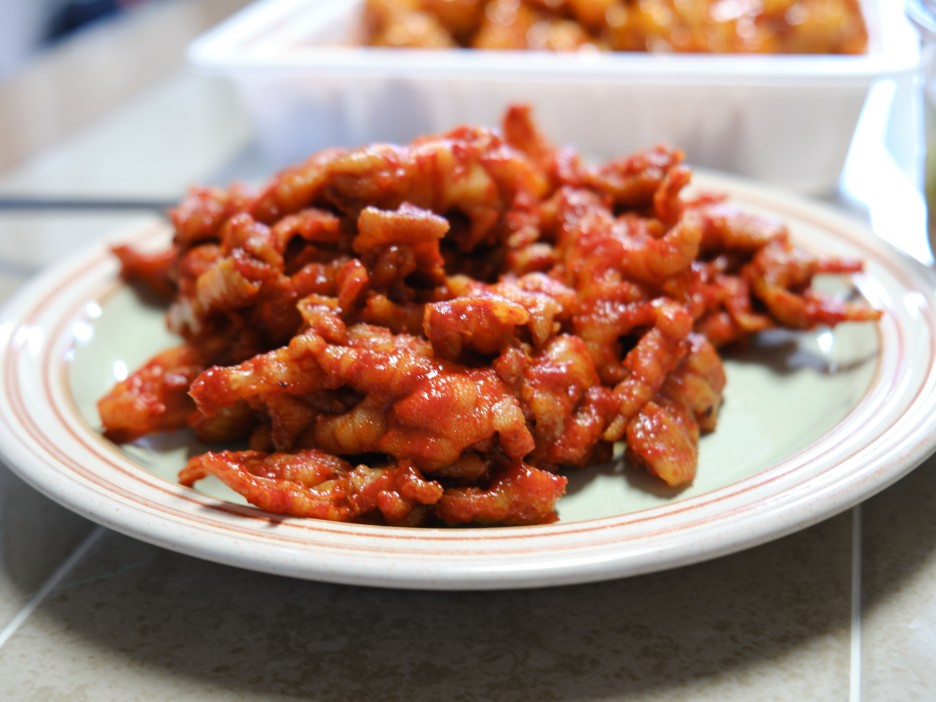 간만에 화창한 날씨 덕인지 화원 전통시장에는 정말 많은 사람들이 나온 바람에 부딪히지 않으려 피해다니는 게 일이 되었다 오늘의 목표물 닭똥집을 사기 위해 단골집 멕시칸치킨에 어렵사리 도착해서 닭똥집을 산 후 닭강정하면 멕시칸, 멕시칸하면 닭강정의 그 닭강정 만원치를 사고 시장을 다시 돌아 거의 다 빠져 나왔다 싶었는데 마지막 관문인 무뼈닭발집을 미처 피하지 못하고 충동구매를 해버렸다