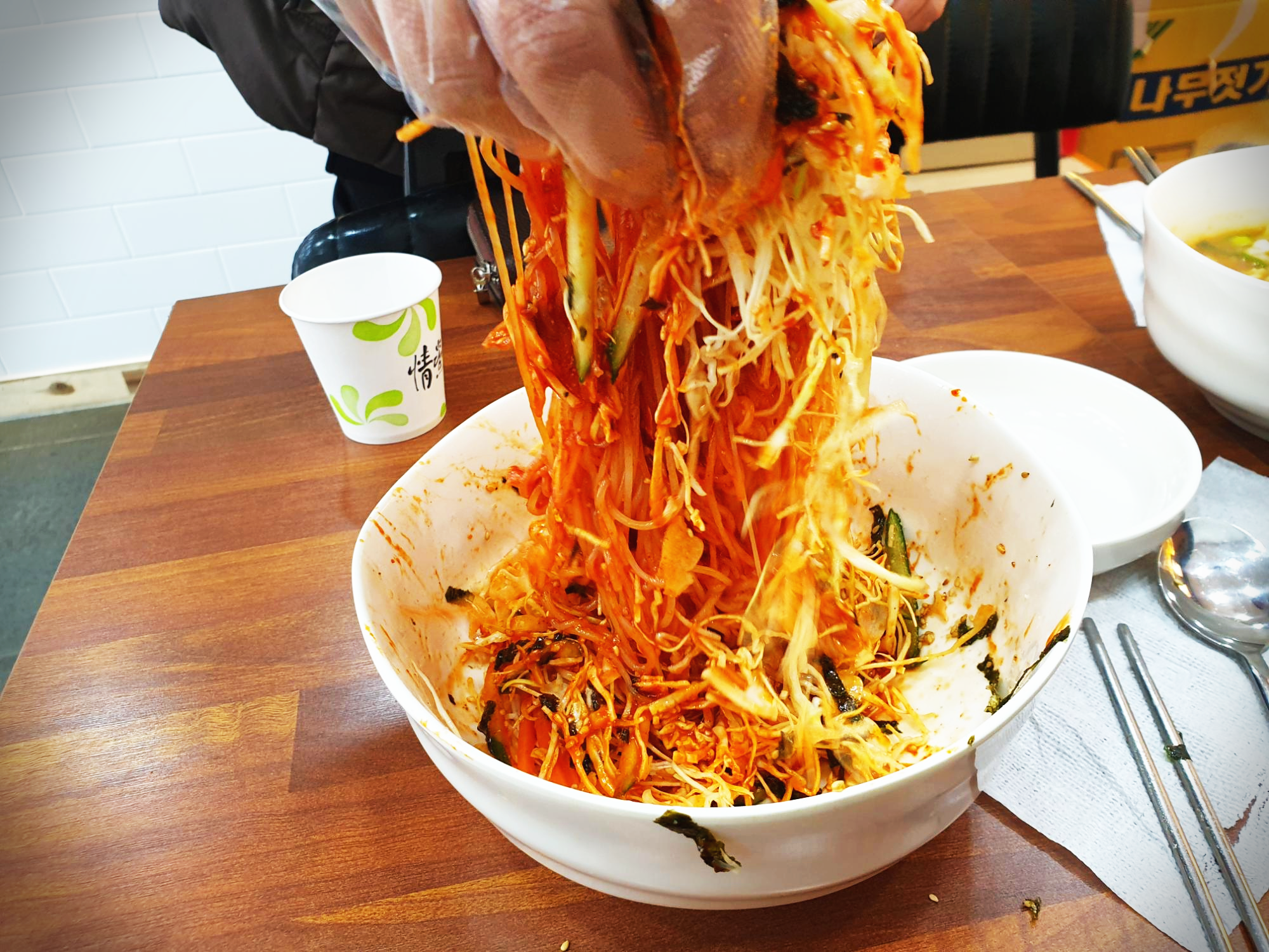 양이 너무 많아 젓가락으로 힘들게 비비고 있자니 비닐 장갑을 사용하면 더 잘 비벼 질 것이라는 점원.